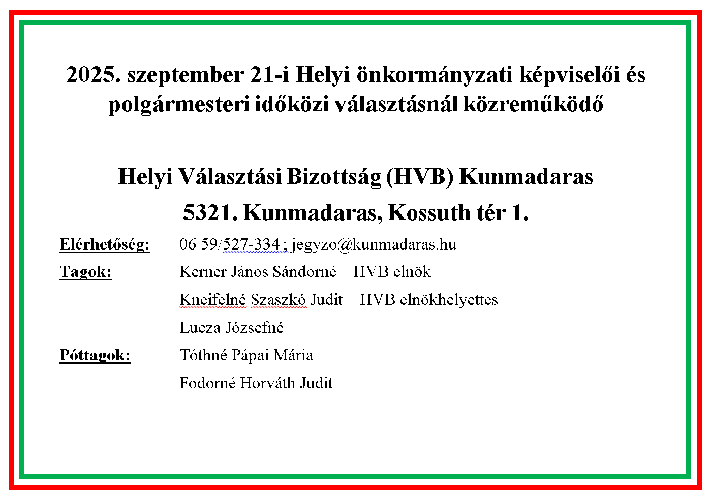 Határozat - A Kunmadaras Nagyközség Helyi Választási Bizottság a Kunmadaras Nagyközségben 2024. 06. 09-én megtartott 2024. évi Roma Nemzetiségi Önkormányzati Képviselő választás eredményeként, a mellékelt jegyzőkönyvben foglaltak alapján megállapítja, hogy a Kunmadaras településen megválasztott roma nemzetiségi önkormányzati választás képviselőjei: |