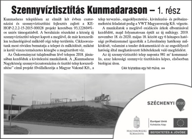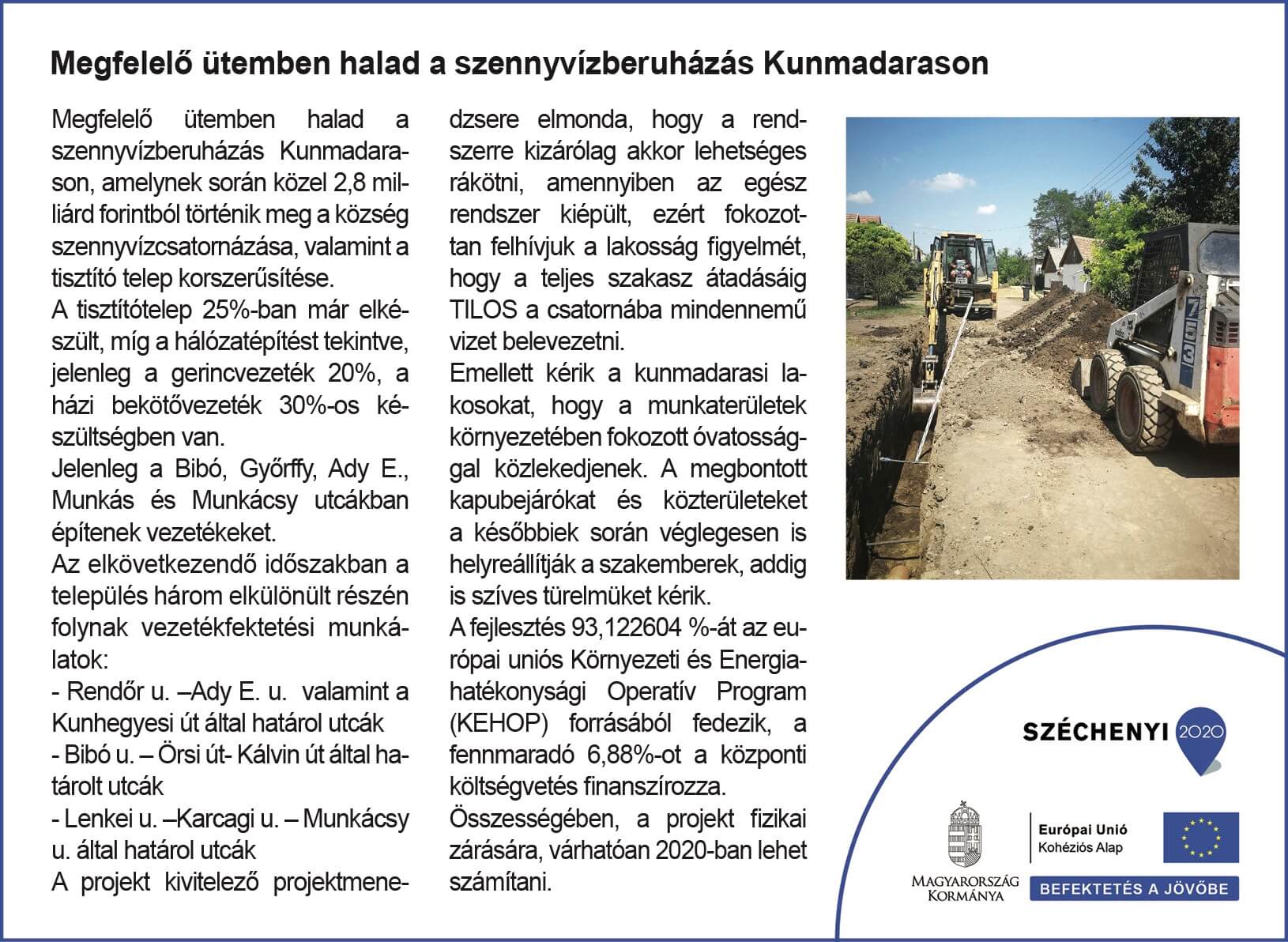 Kunmadaras Nagyközség Önkormányzata 2,768 milliárd forint európai uniós támogatást nyert el a „Kunmadaras nagyközség szennyvízcsatornázása és tisztítótelep korszerűsítése” elnevezésű, KEHOP-2.2.2-15-2015-00028 azonosítószámú projekt megvalósítására.